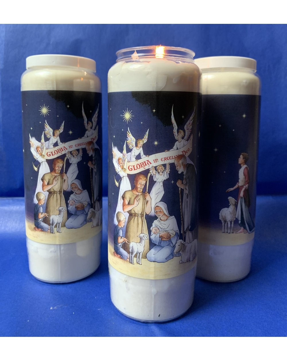 Bougie en paraffine, à l’unité, par carton de quatre (32€) ou de vingt (150€ la caisse). Illustration : étiquette transparente.