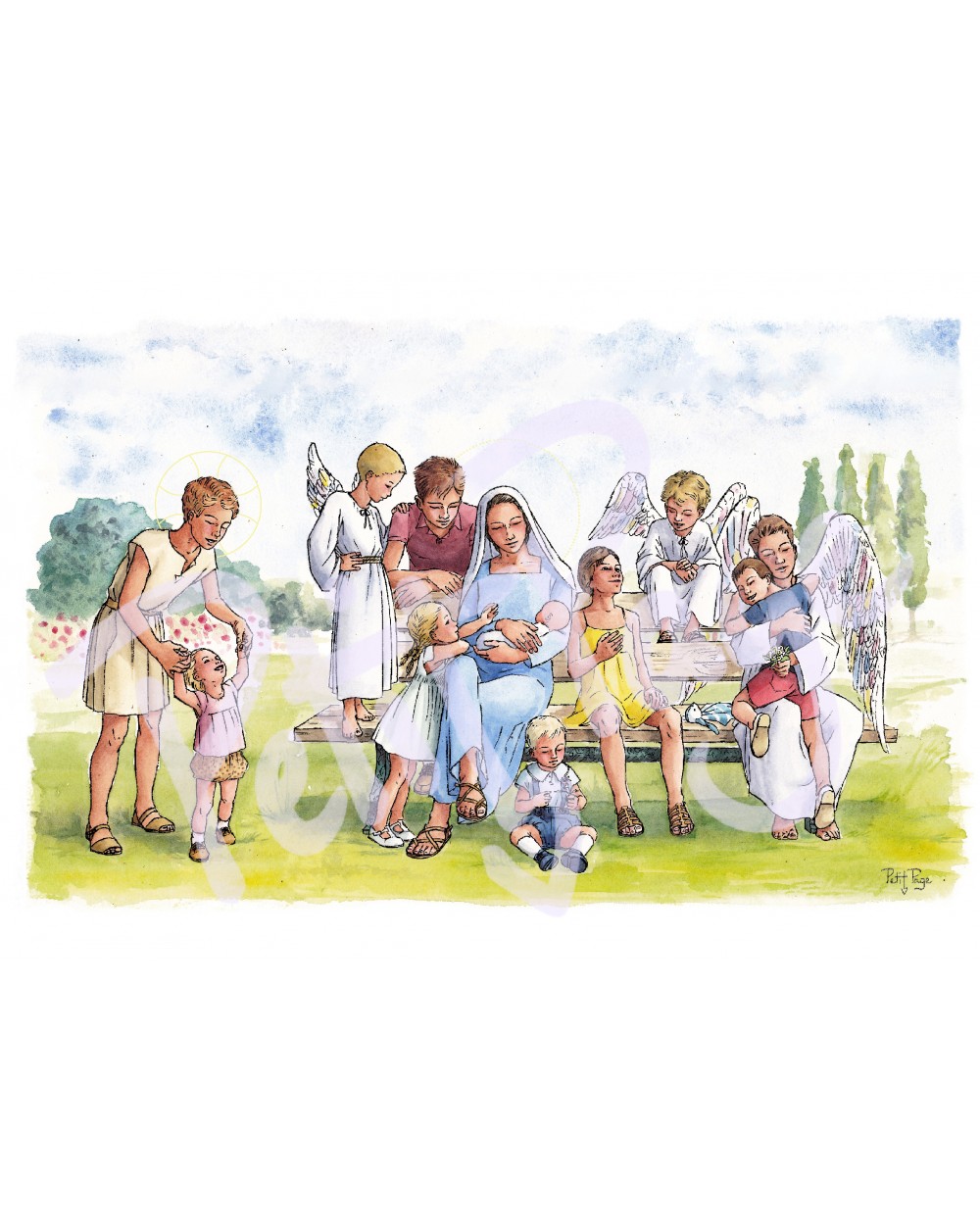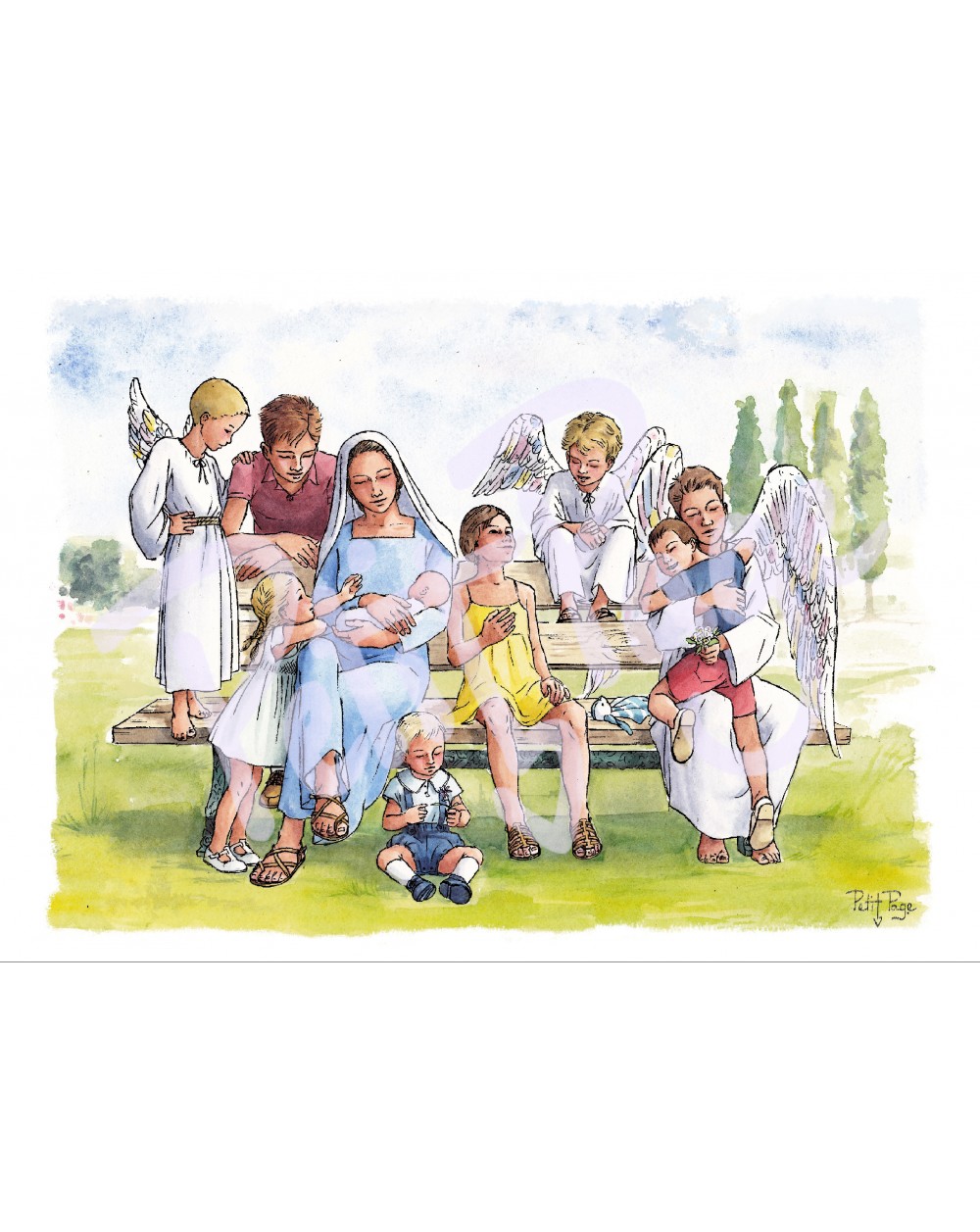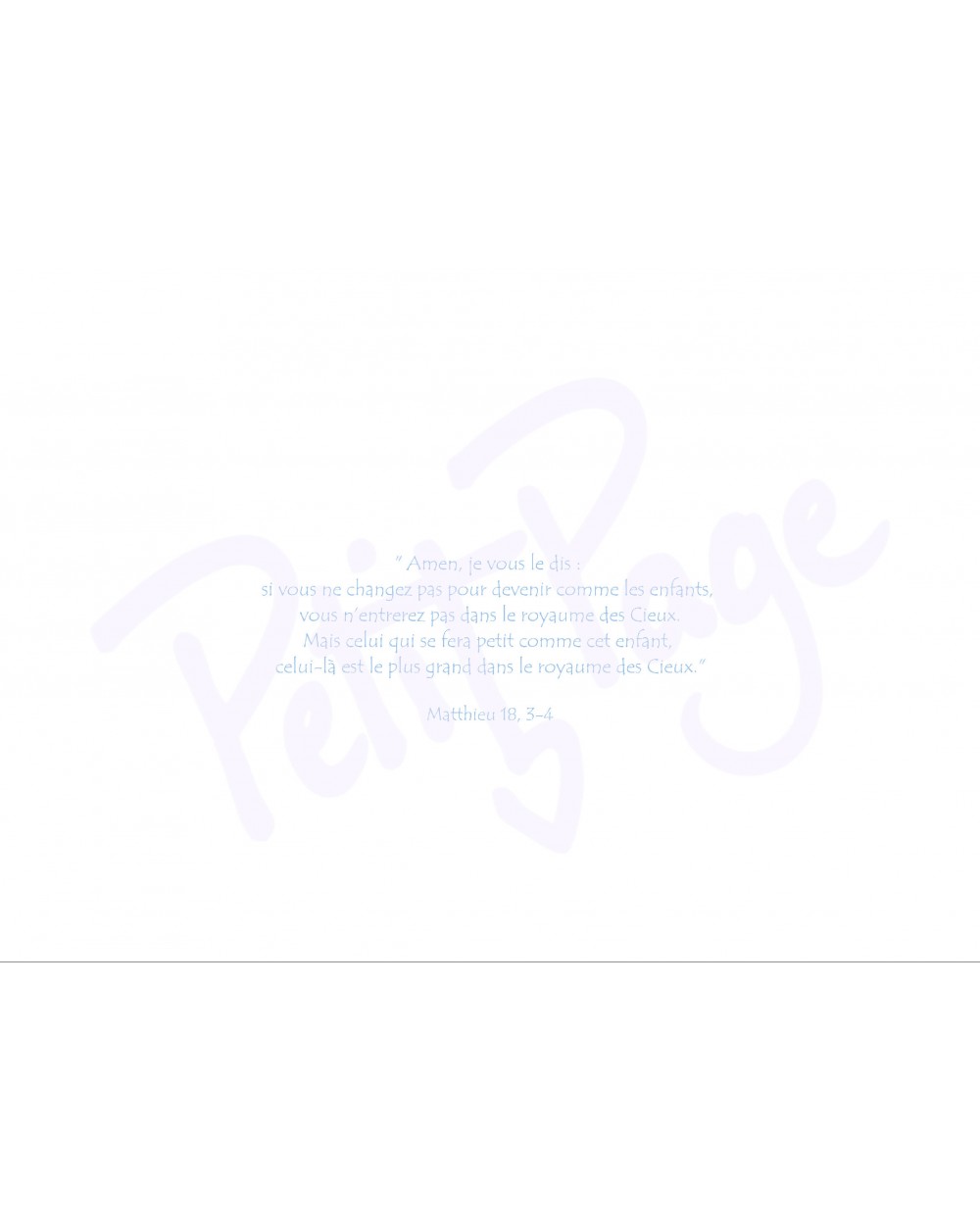 La carte est pliée pour se poser sur un coin prière. Elle comporte au verso un verset biblique :